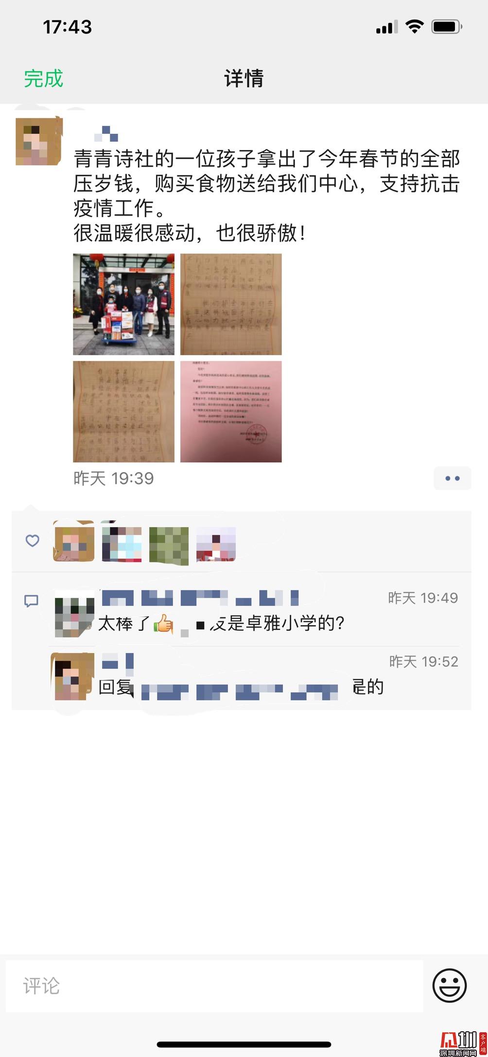 從與家人的密切交談中,他了解到防疫一線工作人員的辛苦,便主動(dòng)聯(lián)系了在深圳疾控中心工作的桃源青青詩社創(chuàng)始人王老師。因?yàn)橘I不到口罩,在王老師的建議下,張赫奕決定捐贈(zèng)食品給加班的工作人員補(bǔ)充營(yíng)養(yǎng)。