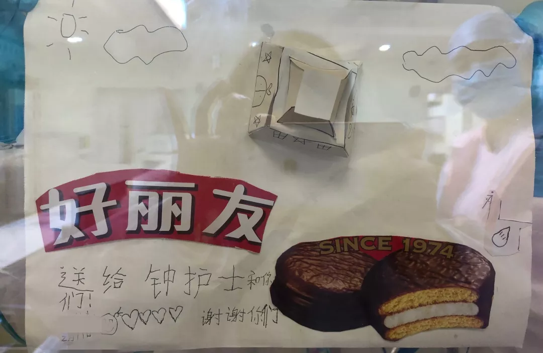 2月11日,深圳市三醫(yī)院兒科護士們收到了一個用好麗友餅干盒制作的手工賀卡,上面寫著“送給鐘護士和你們!謝謝你們”,賀卡上還畫了一張笑臉和四個心形。