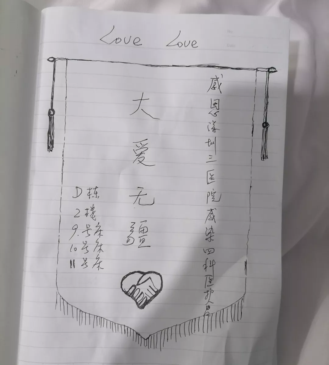 怕孩子們孤單,護士們還會多些時間停留在病房里,陪孩子們看動畫片、給他們講故事、和他們做手工。這些點點滴滴小孩子都看在眼里。那天,在鐘艷護士陪孩子做完手工后,這位小女孩用稚嫩的筆畫寫下了對醫(yī)護人員的愛。