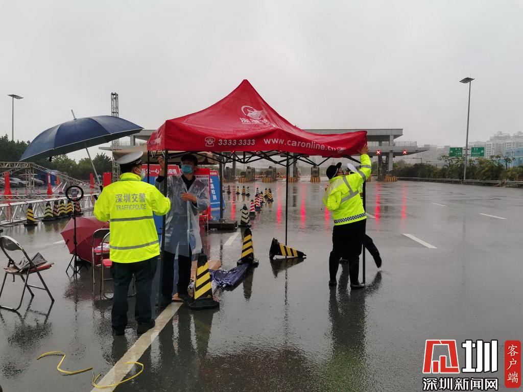 暴雨來臨,深圳交警民警在檢疫點安裝雨棚。