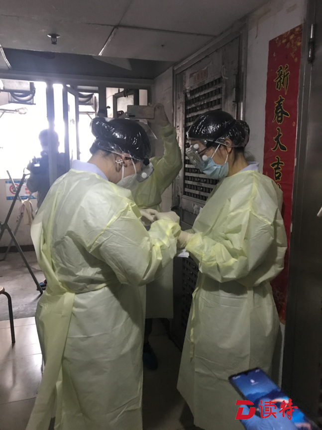 孫女士打開門,將工作人員遞進去的防護裝備穿戴完畢?!盀榱吮Wo醫(yī)護人員的安全,減少交叉感染的可能性,所有的上門檢測都會在樓道里進行?!鄙缈抵行墓ぷ魅藛T說。提前穿好防隔服等防護裝備、拿檢測時給居民坐的凳子、為凳子消毒,開始進行檢測前就需要做很細致的準備工作。