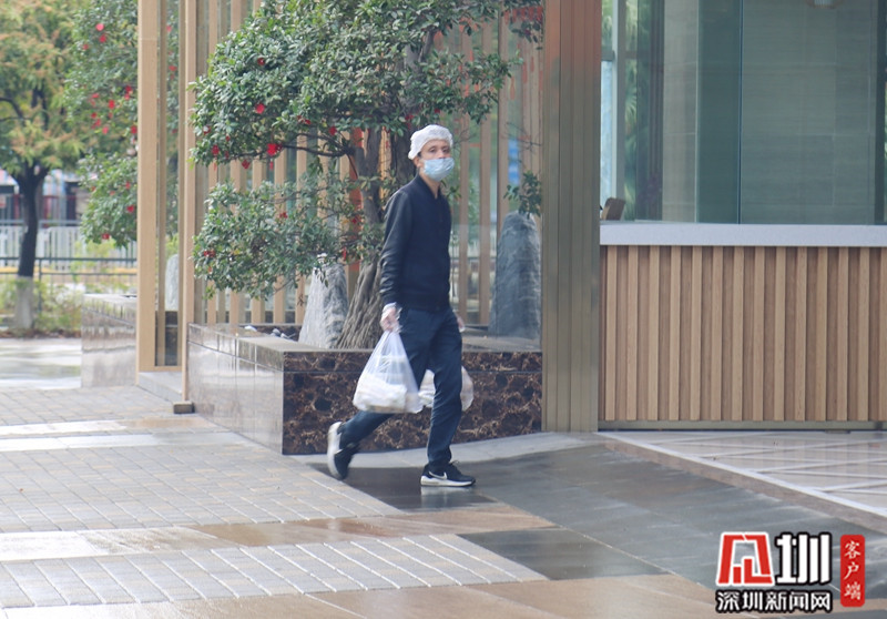 一名送餐人員在園區(qū)內(nèi)送餐。