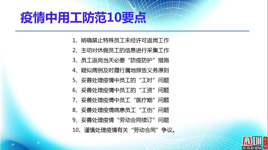 見圳客戶端?深圳新聞網(wǎng)2020年2月18日訊(見圳客戶端、深圳新聞網(wǎng)記者 焦慧茹)疫情影響了社會的方方面面,給企業(yè)和職工帶來了新的問題。對于廣大職工而言,擔(dān)心的是疫情期間工資發(fā)放、復(fù)工安排等。對于企業(yè)而言,擔(dān)心的是如何順利復(fù)工復(fù)產(chǎn)。為此,深圳市總工會聯(lián)合深圳新聞網(wǎng)推出“復(fù)工防疫微課堂”第六期,邀請講師楊文浩,分析、整理了疫情之下企業(yè)復(fù)工用工防范要點(diǎn),幫助大家解決困惑。