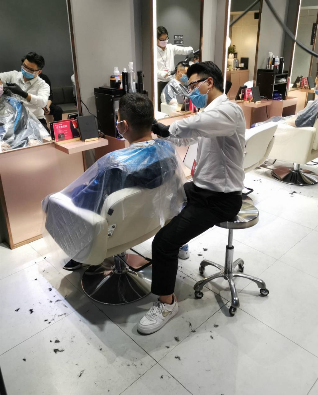 ▲理發(fā)師"準備齊全",顧客佩戴一次性圍布接受服務。