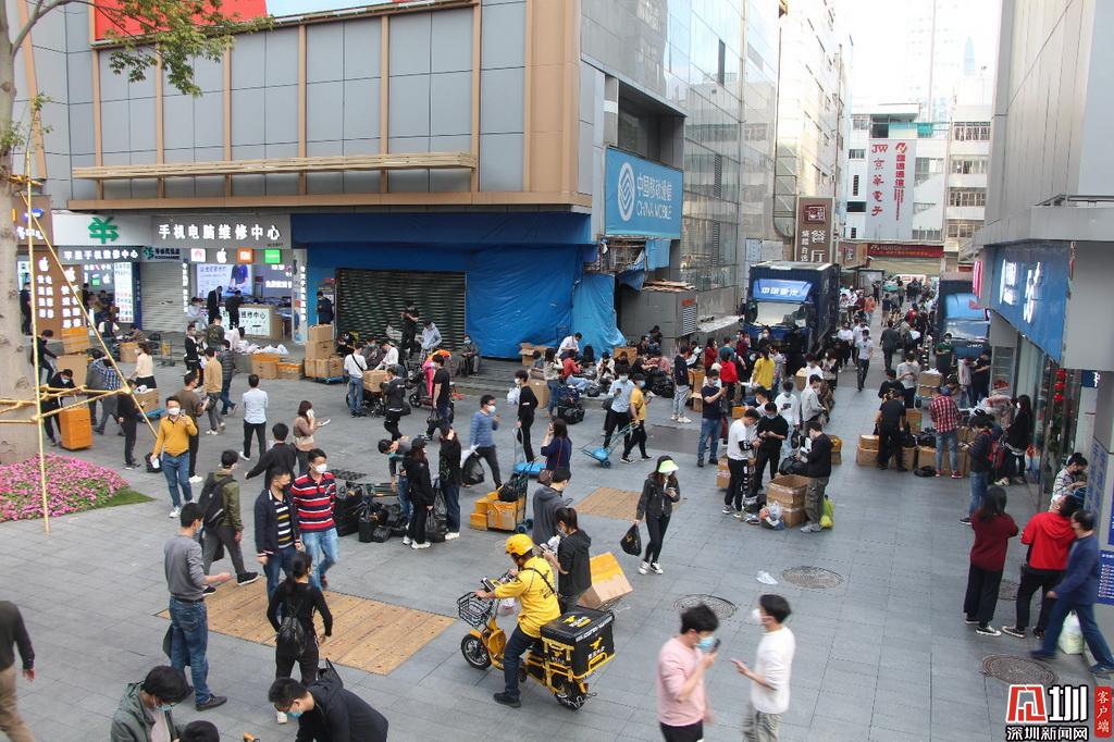 華強北電子商業(yè)街中間則上搭起了許多臨時帳篷,商家正在清點貨物。