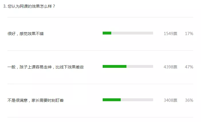 網課的效果到底如何?根據(jù)深圳新聞網的調查,64%的參與者對網課效果感到“滿意”或“一般”。多數(shù)參與者認為“孩子容易走神”或“需要家長時刻監(jiān)管”。在低年級孩子“難以集中注意力”這一問題在留言里尤為突顯。