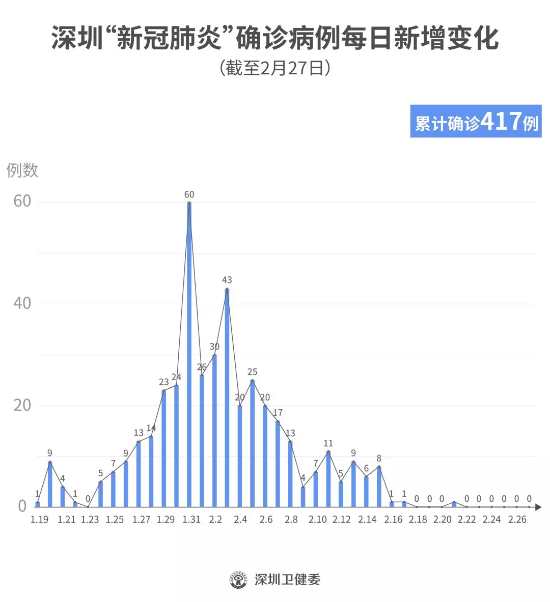 截至2月27日24時,深圳累計報告“新冠肺炎”確診病例417例。2月27日當天全市無新增確診病例,當天出院病例10例(從26日起不再公布出院個案)。
