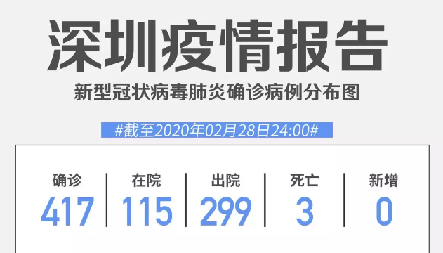 截至2月29日24時,深圳累計報告“新冠肺炎”確診病例417例。2月29日當(dāng)天全市無新增確診病例,當(dāng)天出院病例9例(從26日起不再公布出院個案)。