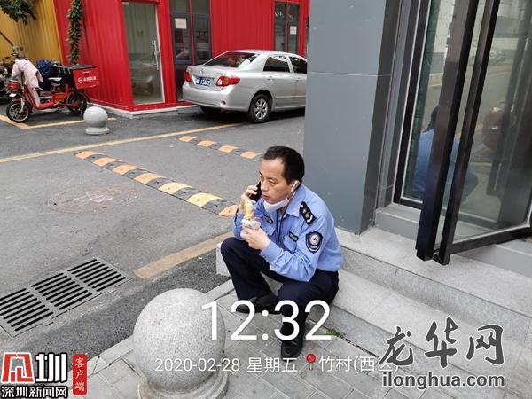 做完返深隔離人員沿途消殺工作,早已錯過飯點,記掛著接下來的種種工作,他轉(zhuǎn)身去便利店買了個面包,坐在店門口的臺階上,隨便對付一下。簡單潦草的一頓午餐,卻是他難得的歇息片刻。