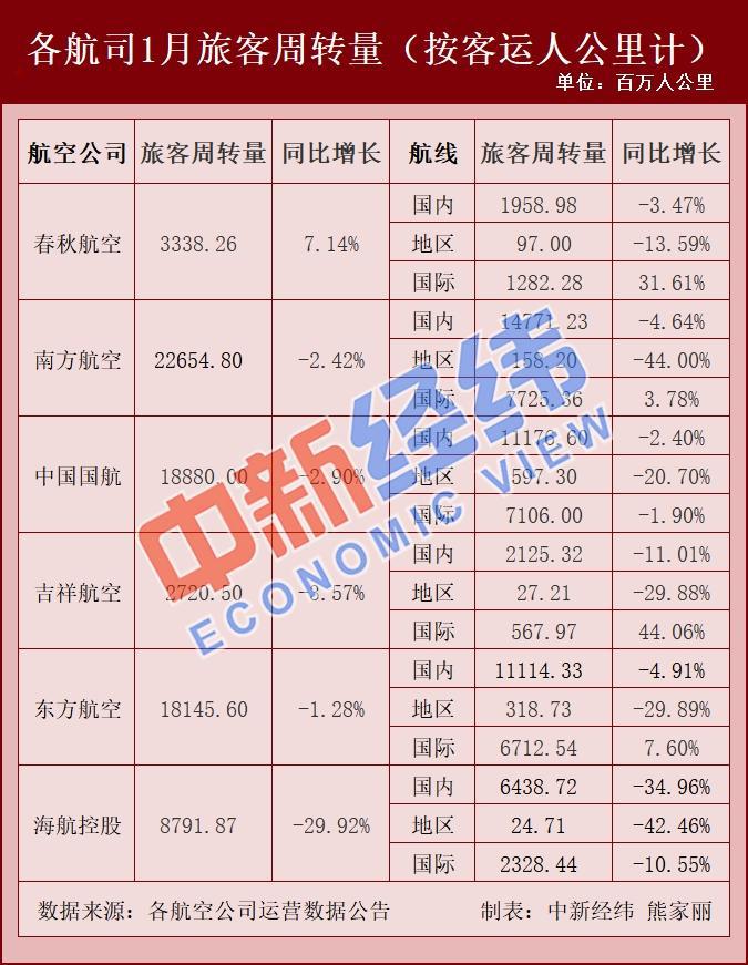 統(tǒng)計(jì)發(fā)現(xiàn),春秋航空、南方航空、吉祥航空等6家航空公司已公布2020年1月運(yùn)營數(shù)據(jù)。從旅客周轉(zhuǎn)量 (按客運(yùn)人公里計(jì) )來看,與去年同期相比,1月僅春秋航空一家上漲,增7.14%,其余5家均同比下降。