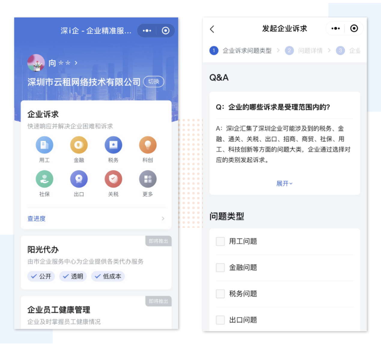 目前,平臺上線的“企業(yè)訴求響應(yīng)”模塊,可以對用工、金融、稅務(wù)、科創(chuàng)、社保、出口、關(guān)稅、商貿(mào)、通關(guān)、招商等方面提供訴求響應(yīng)。企業(yè)通過在平臺填報(bào)自身目前面臨的問題、困難或者相關(guān)訴求信息后,對應(yīng)職能部門建立了一個(gè)專門的訴求處理機(jī)制,將對收到的訴求進(jìn)行第一時(shí)間研究并予以優(yōu)先解答,形成企業(yè)第一時(shí)間反映訴求、政府第一時(shí)間處理訴求、第一時(shí)間解決訴求的閉環(huán)管理鏈條。同時(shí),還建立了上門服務(wù)的機(jī)制,企業(yè)在平臺里面提出的典型訴求,政府工作人員將會安排上門核實(shí)了解情況,以更好推動訴求的解決。