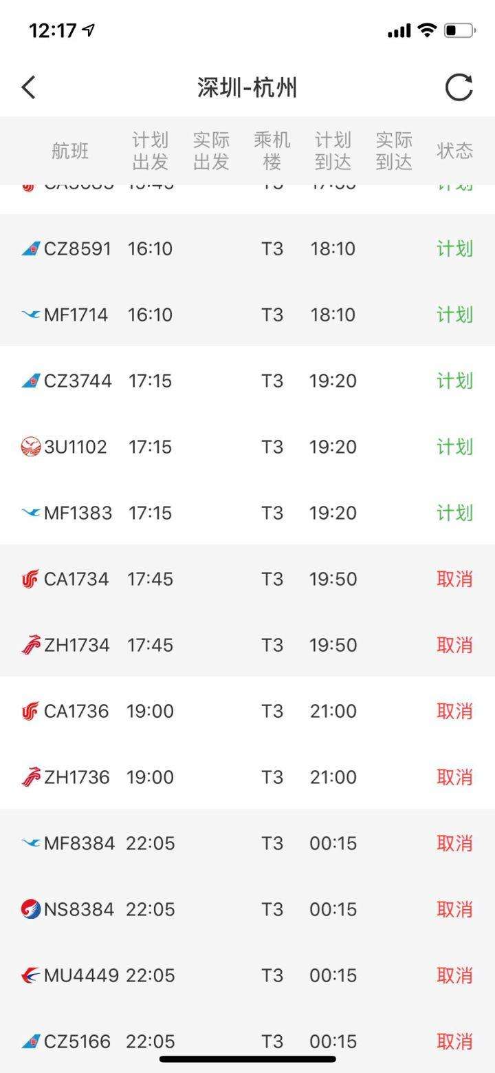 不僅是深圳飛往杭州的CA1736航班,記者發(fā)現(xiàn),今晚深圳飛往北京、上海、南京等國內(nèi)多個(gè)城市的航班,均顯示為取消狀態(tài)。而原計(jì)劃17:45由深圳飛往杭州的CA1734和原計(jì)劃22:05由深圳飛往杭州的MF8384航班,均顯示為取消狀態(tài)。
