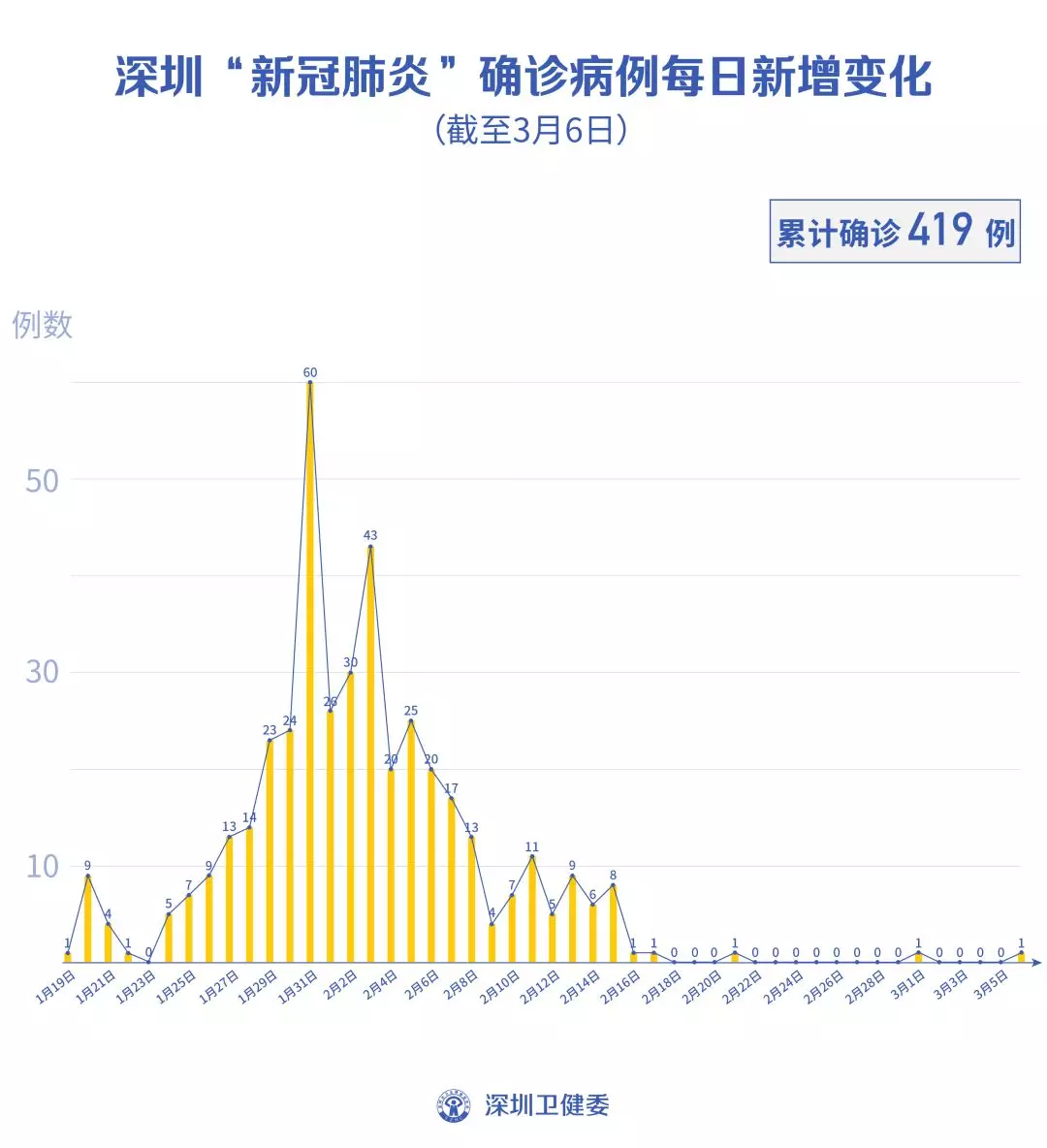 截至3月6日24時,深圳累計報告“新冠肺炎”確診病例419例。3月6日當天全市新增確診病例1例,當天出院病例3例(從2月26日起不再公布出院個案)。