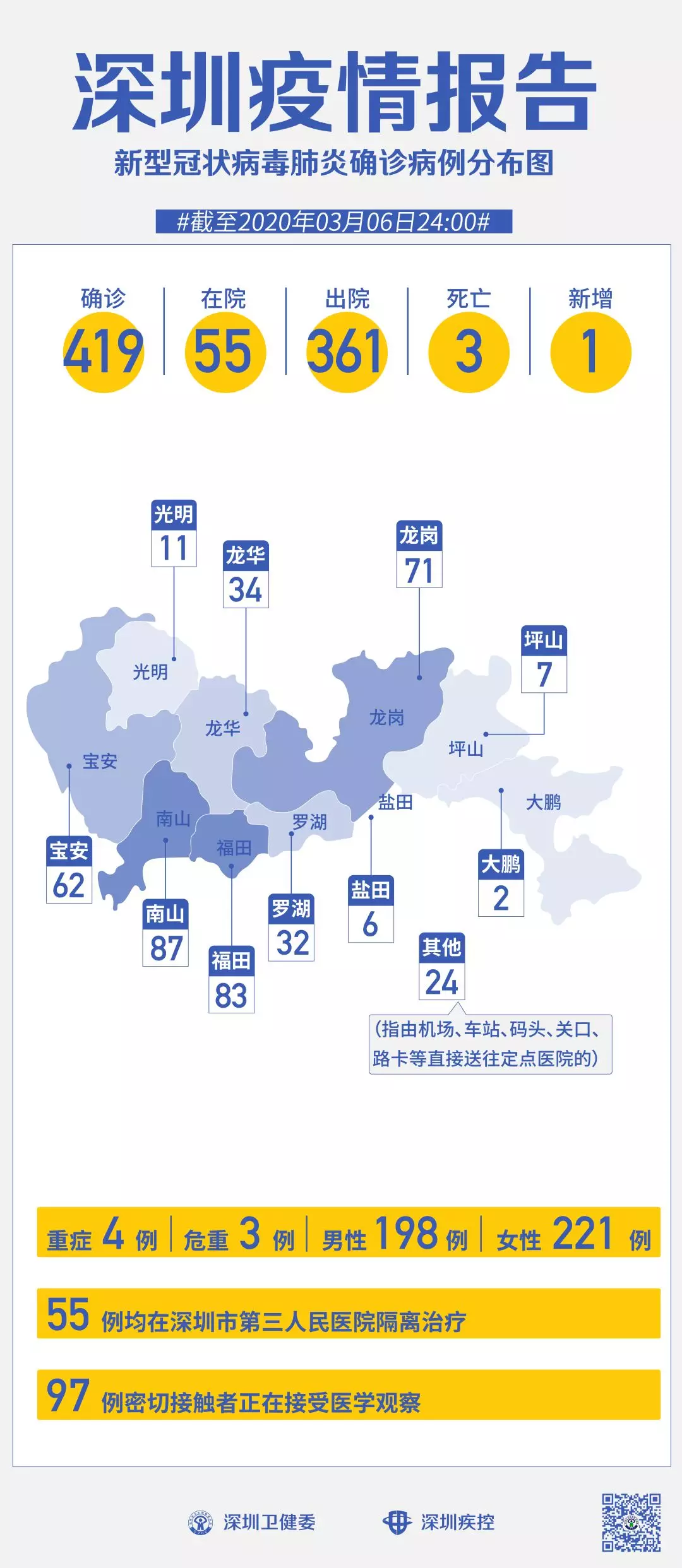 截至3月6日24時,深圳累計報告“新冠肺炎”確診病例419例。3月6日當天全市新增確診病例1例,當天出院病例3例(從2月26日起不再公布出院個案)。