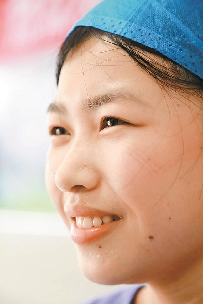 黃青青性格開朗,適應能力強,她平時不愛吃的胡蘿卜、包菜等食物,但到了一線再也不挑食了。身材瘦弱的她在忙碌十多天后有些消瘦,但她總是打趣道:“別看我瘦,力量可大著呢!”協(xié)助病人翻身,耐心為病人喂飯,只要病人需要的,她都會盡自己的全力做好,病區(qū)的病人也為她豎起大拇指。