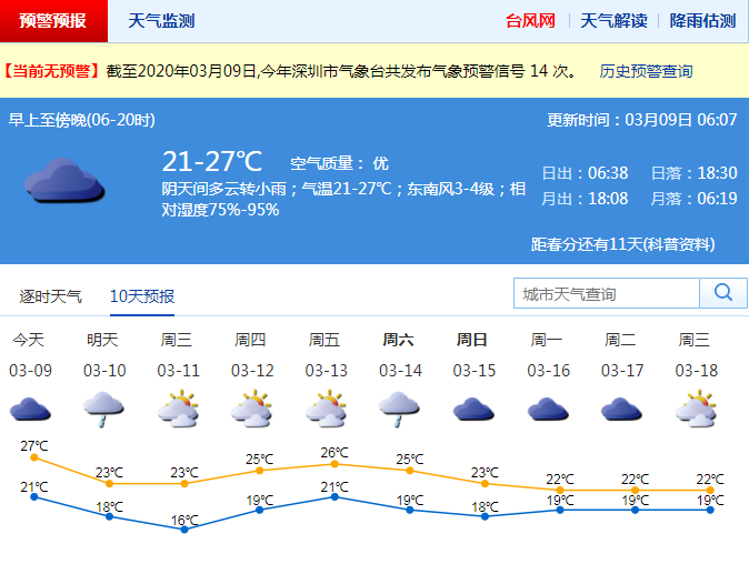 受冷空氣影響,深圳今天有陣雨伴零散雷暴 明起降溫