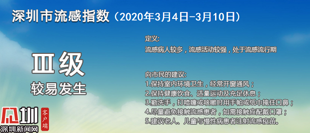 見圳客戶端·深圳新聞網(wǎng)2020年3月9日訊(見圳客戶端、深圳新聞網(wǎng)記者 劉夢婷)根據(jù)深圳市疾控中心公布的深圳市流感指數(shù),3月份以來,深圳均顯示為Ⅲ級(較易發(fā)生),目前深圳處于流感流行期,流感活動(dòng)較強(qiáng),流感病人較多。