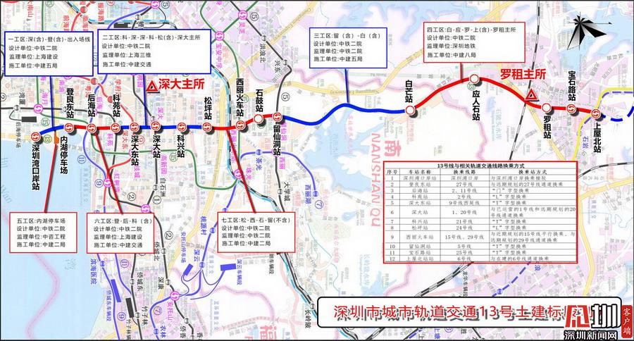 據(jù)了解,地鐵13號線由南至北穿過南山區(qū)、寶安區(qū)和光明新區(qū)。項目共設(shè)車站16座,線路總長22.436公里,出入線與后海站接軌,將穿越已運(yùn)營的地鐵1號線、2號線、5號線、11號線。由于沿途工程地質(zhì)條件復(fù)雜、換乘站多、工程實施難度大、長區(qū)間盾構(gòu)、拆遷工作繁重、交通疏解復(fù)雜等原因,13號線被稱為深圳地鐵建設(shè)史上最難的地鐵線路之一。
