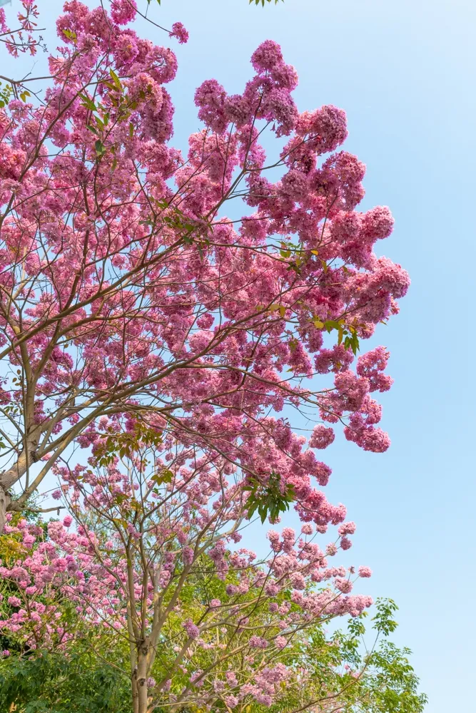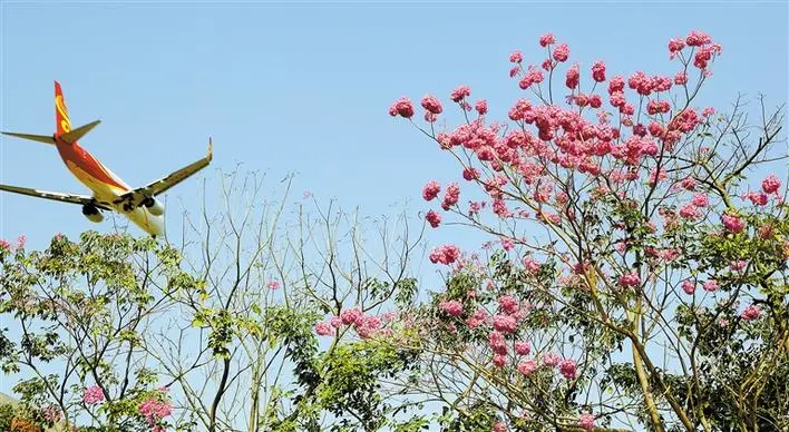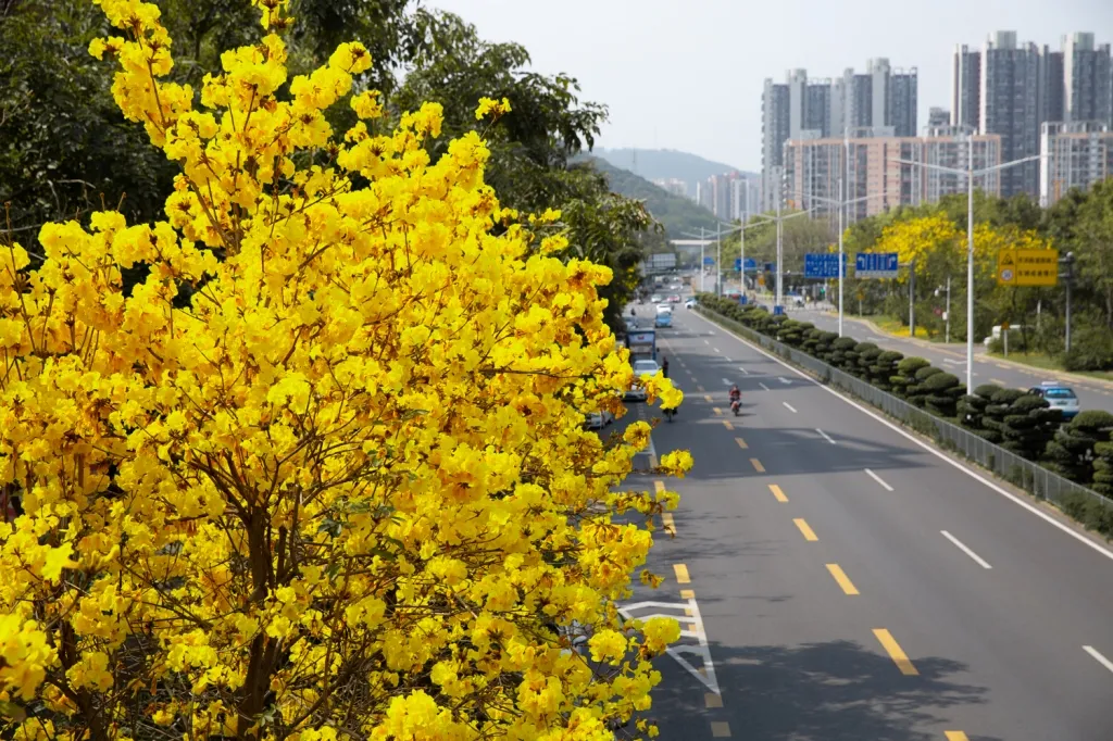 寶安航城街道機場南路兩旁,風(fēng)鈴木花綻放。