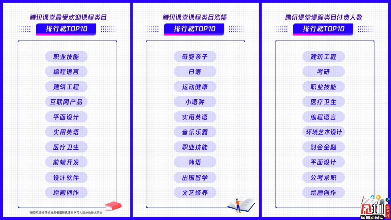 見(jiàn)圳客戶端·深圳新聞網(wǎng)2020年3月18日訊(見(jiàn)圳客戶端、深圳新聞網(wǎng)記者 劉夢(mèng)婷)近日,在線職業(yè)教育平臺(tái)騰訊課堂發(fā)布數(shù)據(jù)報(bào)告:戰(zhàn)“疫”宅家期間,該平臺(tái)上課總時(shí)長(zhǎng)提升3.5倍。同時(shí),騰訊課堂還發(fā)布了最受歡迎課程類目(學(xué)習(xí)人數(shù))排行榜TOP10:職業(yè)技能、編程語(yǔ)言、建筑工程、互聯(lián)網(wǎng)產(chǎn)品、平面設(shè)計(jì)、實(shí)用英語(yǔ)、醫(yī)療衛(wèi)生、前端開(kāi)發(fā)、設(shè)計(jì)軟件、繪畫(huà)創(chuàng)作。此外母嬰親子、日語(yǔ)、運(yùn)動(dòng)健康等課程學(xué)習(xí)人數(shù)同比漲幅均超過(guò)400%,成騰訊課堂增速最快類目,或成為未來(lái)在線職業(yè)教育新的增長(zhǎng)點(diǎn)。IT互聯(lián)網(wǎng)就業(yè)類課程、工業(yè)產(chǎn)品設(shè)計(jì)類課程付費(fèi)能力強(qiáng),付費(fèi)人數(shù)同比漲幅超過(guò)50%。