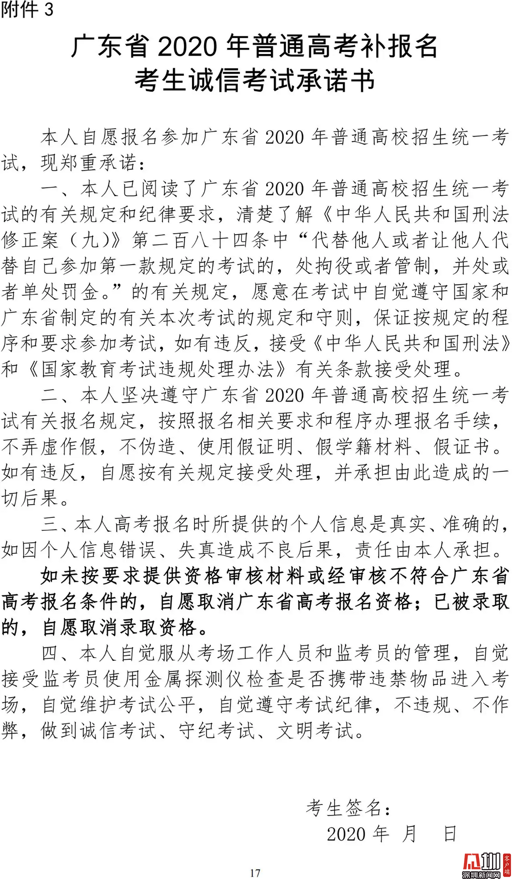 見圳客戶端·深圳新聞網2020年3月19日訊(見圳客戶端、深圳新聞網記者 金洪竹)3月18日,記者從廣東省招生委員會辦公室獲悉,為滿足退伍軍人、運動訓練及武術與民族傳統(tǒng)體育考生、高職院校自主招生考生等符合我省高考條件,因各種原因尚未參加高考報名人員的需求,經研究決定安排一次高考補報名,補報名時間為3月23-26日。同時,為確??忌涂荚嚬ぷ魅藛T的生命安全和身體健康,減少聚集,本次高考補報名采取先線上辦理、后補驗材料的方式進行。