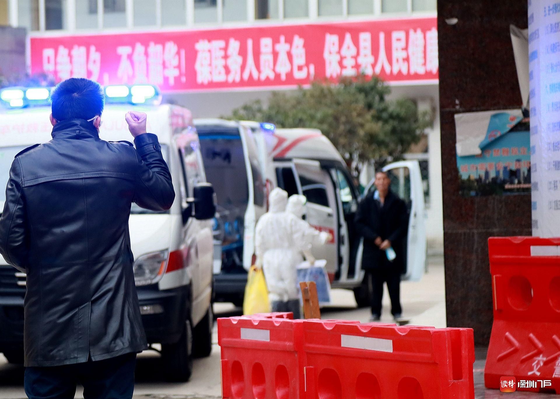 2月29日,監(jiān)利縣中醫(yī)院,一位重癥患者即將轉(zhuǎn)往荊州救治?;颊叩膬鹤勇動嵹s來,遠遠地向父親舉起拳頭,高喊“加油”。