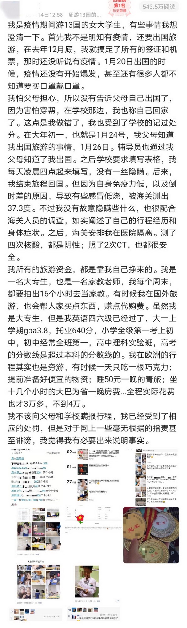 小Y后來知道,她的經(jīng)歷在網(wǎng)上引起關(guān)注并引發(fā)網(wǎng)友質(zhì)疑。記者從網(wǎng)上了解到,網(wǎng)友目前主要質(zhì)疑其旅行費用來源,對此,小Y表示:“因為之前在網(wǎng)上看到別的女生花一萬五窮游了11個國家,所以我也很想試一下,就開始很仔細(xì)的規(guī)劃,花了很多心思,我所有的旅行費用都是我自己平時做家教賺的,出去玩也基本上是窮游?!贝送猓還將旅行所有費用明細(xì)列出并在本人微博上公布。