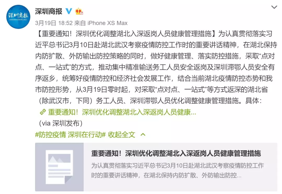 疫情發(fā)生初期,深圳商報(bào)微博創(chuàng)建話題 #防控疫情 深圳在行動(dòng)# ,以高度的責(zé)任感和使命感全方位加強(qiáng)宣傳報(bào)道和輿論引導(dǎo),疫情相關(guān)信息均帶話題發(fā)布,人們可以系統(tǒng)地查看疫情相關(guān)信息。