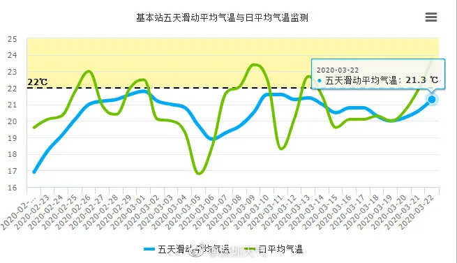 以5天滑動平均氣溫穩(wěn)定>22 ℃ 為春季結束、夏季開始,看圖一中的藍色曲線(五天滑動平均氣溫)已經在抬頭了,能不突破虛線還得看接下來幾天的氣溫。