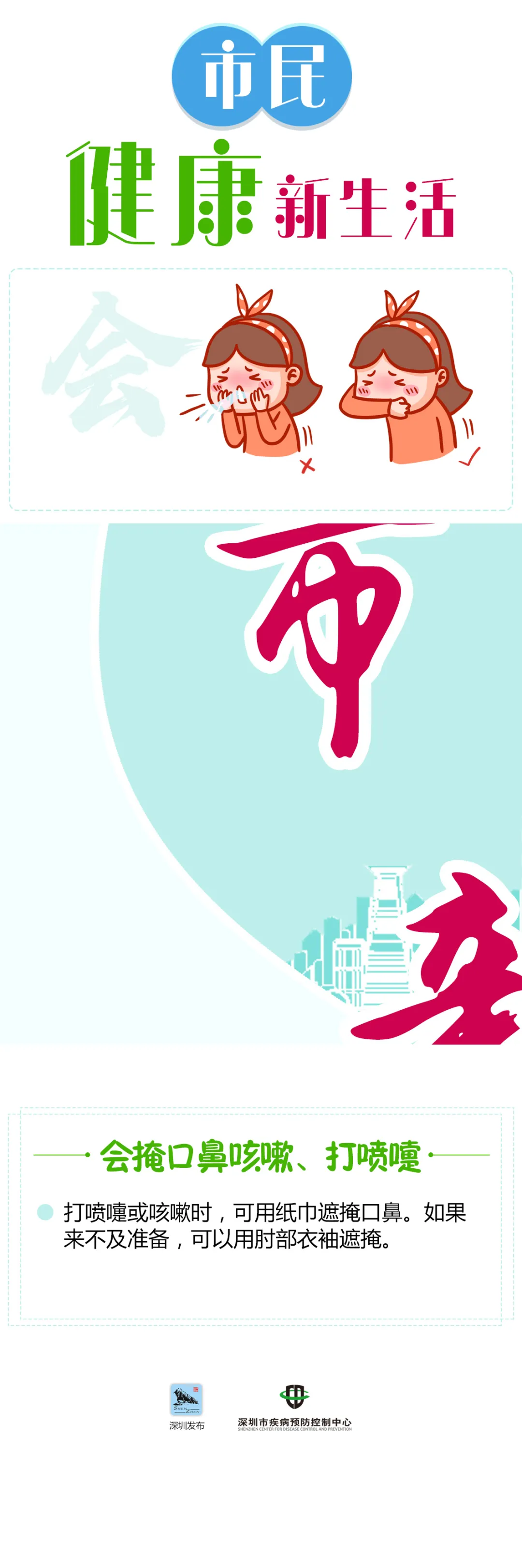 打噴嚏或咳嗽時,可用紙巾遮掩口鼻。如果來不及準備,可以用肘部衣袖遮掩。
