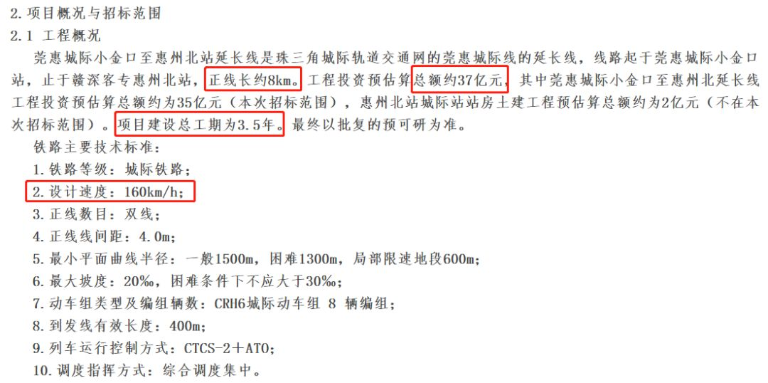 此間公示的莞惠城際小金口至惠州北站延長線,則是珠三角城際軌道交通網的莞惠城際線的延長線,線路起于莞惠城際小金口站,止于贛深客?;葜荼闭?,正線長約8km,設計速度為160km/h。工程投資預估算總額約37億元,其中莞惠城際小金口至惠州北延長線工程投資預估算總額約為35億元(本次招標范圍),惠州北站城際站站房土建工程預估算總額約為2億元(不在本次招標范圍)。