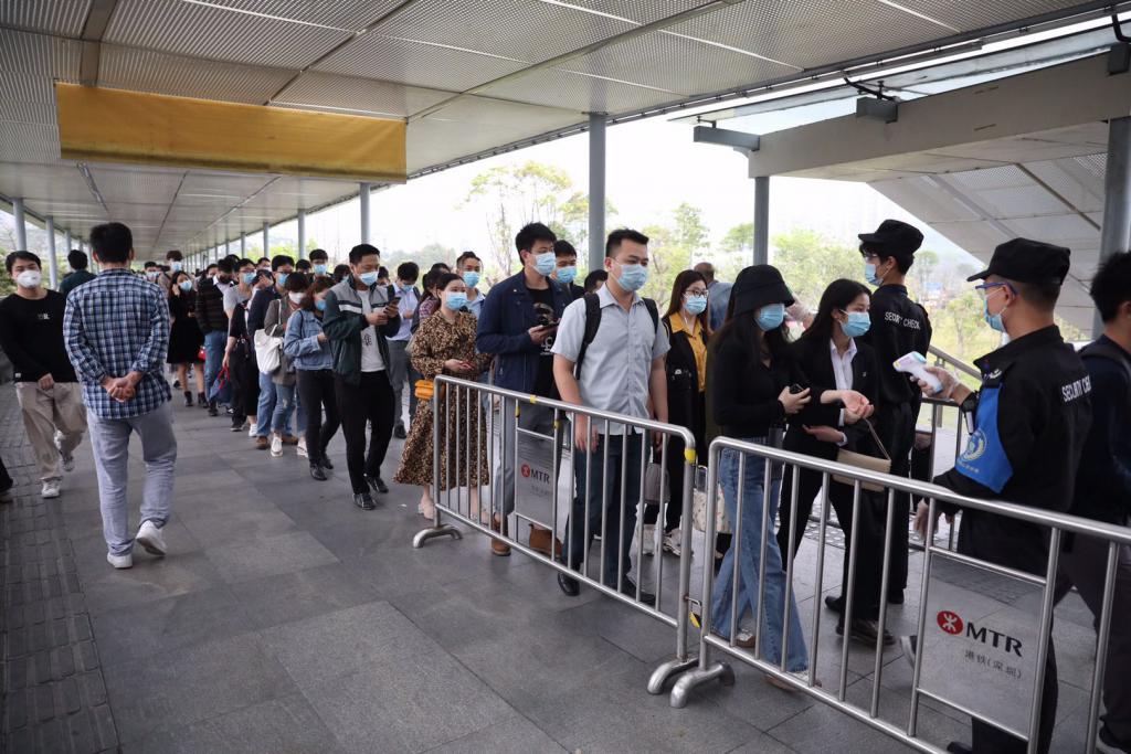 7點(diǎn)30分,深晚另一路記者從五號(hào)線(xiàn)長(zhǎng)龍站進(jìn)站,進(jìn)站較順利沒(méi)有排長(zhǎng)隊(duì),但是車(chē)上較擁擠,沒(méi)有座位。到達(dá)深圳北站后,在轉(zhuǎn)4號(hào)線(xiàn)去民樂(lè)站時(shí)排起了長(zhǎng)隊(duì),大概等了13分鐘,才勉強(qiáng)擠進(jìn)4號(hào)線(xiàn),車(chē)上幾乎沒(méi)有空間,身體無(wú)法動(dòng)彈。8點(diǎn)17分從民樂(lè)出站,連同排隊(duì)等車(chē),9站地鐵一共用時(shí)近50分鐘。