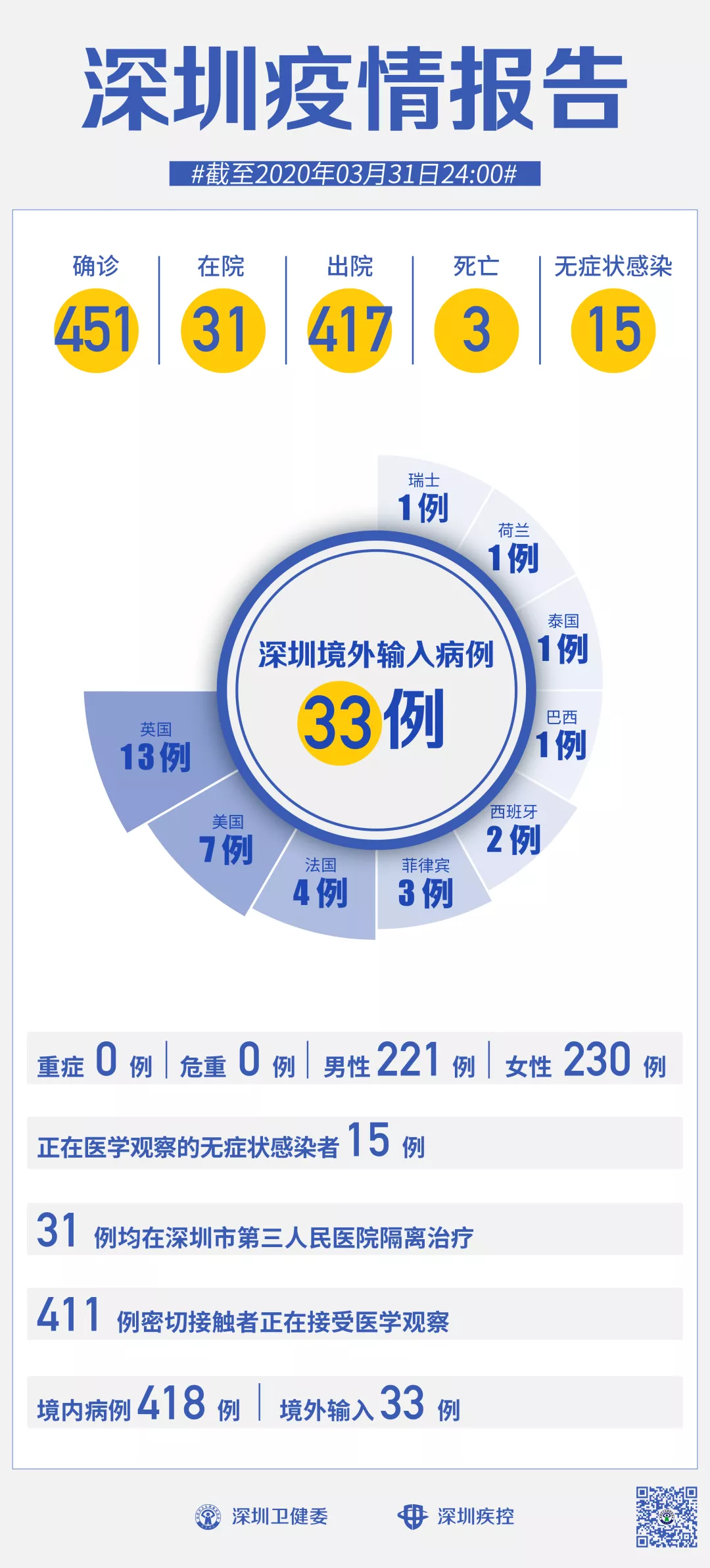 截至3月31日24時,深圳累計報告新冠肺炎病例451例。3月31日當天新增境內(nèi)病例1例、無癥狀感染者1例。 【境內(nèi)病例】:新增1例湖北返深確診病例,出院1例,累計報告境內(nèi)病例418例。 【境外輸入】:當日無新增病例,累計報告境外輸入病例33例。 【無癥狀感染者】:新增1例湖北返深無癥狀感染者。全市尚在醫(yī)學觀察的無癥狀感染者15例,其中境外輸入9例。 累計報告確診病例中,男性221例、女性230例。 目前,死亡3例,累計出院417例。31例確診病例均在深圳市第三人民醫(yī)院隔離治療。 411名密切接觸者正在接受醫(yī)學觀察。 無癥狀感染者7問7答 01.什么是新型冠狀病毒無癥狀感染者? 新冠病毒無癥狀感染者(以下簡稱無癥狀感染者)是指無相關臨床癥狀,如發(fā)熱、咳嗽、咽痛等可自我感知或可臨床識別的癥狀與體征,但呼吸道等標本新冠病毒病原學檢測陽性者。無癥狀感染者可分為兩種情形: 一是感染者核酸檢測陽性,經(jīng)過14天潛伏期的觀察,均無任何可自我感知或可臨床識別的癥狀與體征,始終為無癥狀感染狀態(tài); 二是感染者核酸檢測陽性,采樣時無任何可自我感知或可臨床識別的癥狀與體征,但隨后出現(xiàn)某種臨床表現(xiàn),即處于潛伏期的“無癥狀感染”狀態(tài)。 02.無癥狀感染者有無傳染性? 根據(jù)國家和部分省份開展的密切接觸者監(jiān)測數(shù)據(jù),無癥狀感染者的密切接觸者存在二代病例續(xù)發(fā),流行病學調查中發(fā)現(xiàn)個別由無癥狀感染者導致的聚集性疫情,有小樣本量的研究顯示無癥狀感染者呼吸道樣本中的病毒載量與確診病例沒有太大差異。 綜合目前的監(jiān)測和研究,無癥狀感染者存在傳染性,但其傳染期長短、傳染性強弱、傳播方式等尚需開展進一步科學研究。 部分專家認為鑒于無癥狀感染者的呼吸道標本能檢出病原核酸,但由于無咳嗽、打噴嚏等臨床癥狀,病原排出體外引起傳播的機會較確診病例相對少一些。 03.我國關于新型冠狀病毒無癥狀感染者的防控要求是什么? 國家衛(wèi)生健康委在1月28日發(fā)布《新冠病毒感染的肺炎防控方案》(第三版)中就將新型冠狀病毒無癥狀感染者納入防控管理,在其后的修訂過程中均對無癥狀感染者的報告、管理等提出了明確具體的要求。各級各類醫(yī)療衛(wèi)生機構發(fā)現(xiàn)無癥狀感染者,應于2小時內(nèi)進行網(wǎng)絡直報。 縣(區(qū))級疾控機構接到無癥狀感染者報告后,24小時內(nèi)完成個案調查,并及時進行密切接觸者登記,將個案調查表或調查報告及時通過傳染病報告管理信息系統(tǒng)進行上報。 無癥狀感染者應集中隔離14天,原則上集中隔離滿14天且兩次連續(xù)標本核酸檢測陰性者(采樣時間至少間隔24小時)可解除隔離; 如果核酸檢測仍為陽性者,則繼續(xù)隔離醫(yī)學觀察。 隔離醫(yī)學觀察期間如出現(xiàn)臨床表現(xiàn),應及時轉歸為確診病例,進行規(guī)范治療。 無癥狀感染者密切接觸者也要進行14天的集中隔離醫(yī)學觀察。 04.無癥狀感染者通過什么途徑發(fā)現(xiàn)?截至目前我國發(fā)現(xiàn)了多少例無癥狀感染者? 目前我們主要通過以下途徑主動發(fā)現(xiàn)無癥狀感染者: 一是對新型冠狀病毒肺炎病例的密切接觸者開展醫(yī)學觀察期間的主動檢測; 二是在聚集性疫情調查中開展的主動檢測; 三是在新型冠狀病毒肺炎病例的傳染源追蹤過程中對暴露人群主動檢測; 四是對部分有境內(nèi)外新型冠狀病毒肺炎病例持續(xù)傳播地區(qū)的旅行史和居住史人員開展主動檢測。 05.如何做好無癥狀感染者的風險評估及其防控? 無癥狀感染者存在著傳播風險。 一是傳播的隱匿性。由于無癥狀感染者無任何明顯的癥狀與體征,其在人群中難以被發(fā)現(xiàn),其導致的傳播也難以預防。 二是癥狀的主觀性。癥狀輕微或不典型者可能認為自己沒有感染新冠病毒,不主動去醫(yī)療機構就診,在日常的診療工作中難以被發(fā)現(xiàn)。 三是發(fā)現(xiàn)的局限性。由于存在檢測窗口期,采用核酸檢測和血清學檢測方法難以發(fā)現(xiàn)全部無癥狀感染者,現(xiàn)有的無癥狀感染者主要是通過病例的密切接觸者主動篩查、感染來源調查、聚集性疫情調查和對高風險地區(qū)人員的主動檢測發(fā)現(xiàn)的,尚有部分無癥狀感染者難以被發(fā)現(xiàn)。 為此,要突出做好無癥狀感染者監(jiān)測,有針對性加大篩查力度,將檢測范圍擴大至已發(fā)現(xiàn)病例和無癥狀感染者的密切接觸者、重點地區(qū)和重點人群等。一旦發(fā)現(xiàn)無癥狀感染者,要立即按“四早”要求,嚴格集中隔離和醫(yī)學觀察,對密切接觸者也要實施隔離醫(yī)學觀察。 由于部分無癥狀感染者始終無癥狀,實際防控工作中無法將發(fā)現(xiàn)和隔離無癥狀感染者作為主導措施。因此我們?nèi)詫⒗^續(xù)著重于及時發(fā)現(xiàn)隔離確診患者,并做好密切接觸者管理。 我國經(jīng)驗表明,做好確診病例的及時發(fā)現(xiàn)和隔離,并適度采取減少人際接觸等措施,可以基本阻斷疫情傳播。 06.下一步如何做好無癥狀感染者防控管理? 一是完善防治方案。 抓緊在疫情重點地區(qū)抽取一定比例樣本,開展無癥狀感染者調查和流行病學分析研究,完善防控措施,修訂完善防控方案和診療方案,科學應對無癥狀感染者帶來的感染風險,遏制可能形成新