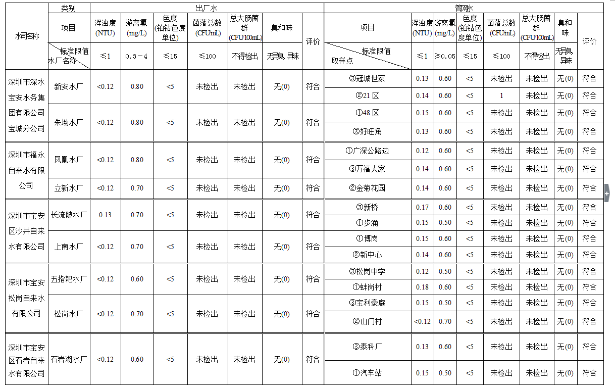 見圳客戶端·深圳新聞網(wǎng)2020年4月4日訊(見圳客戶端、深圳新聞網(wǎng)記者葉梅)2020年2月,深圳市水務(wù)局對(duì)全市42個(gè)水廠出廠水水樣以及68個(gè)管網(wǎng)水水樣進(jìn)行了抽檢。檢測(cè)結(jié)果表明,依據(jù)GB5749—2006《生活飲用水衛(wèi)生標(biāo)準(zhǔn)》,所有受檢42個(gè)出廠水水樣和68個(gè)管網(wǎng)水水樣的渾濁度、消毒劑(游離氯或二氧化氯或總氯)、色度、菌落總數(shù)、總大腸菌群及臭和味共6項(xiàng)常規(guī)指標(biāo)全部符合該標(biāo)準(zhǔn)的規(guī)定,出廠水水樣合格率為100%,管網(wǎng)水合格率為100%。