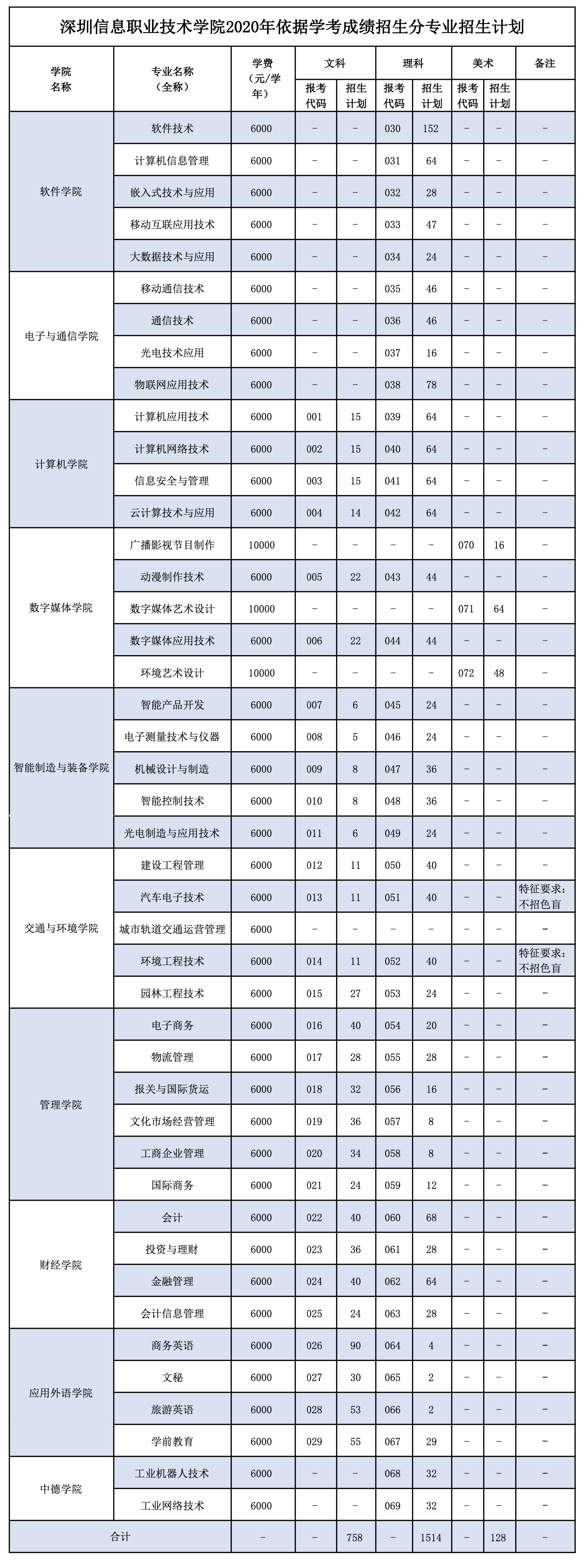 “依學考成績錄取”是深圳信息學院2020年春季高考招生重要形式之一,今年學校計劃招生2400人,面向文科計劃招生758人,理科計劃招生1514人,美術(shù)計劃招生128人。該校軟件學院、電子與通信學院、計算機學院、數(shù)字媒體學院、智能制造與裝備學院、交通與環(huán)境學院、管理學院、財經(jīng)學院、應(yīng)用外語學院、中德學院等10個學院均有招生計劃,招生專業(yè)共43個。