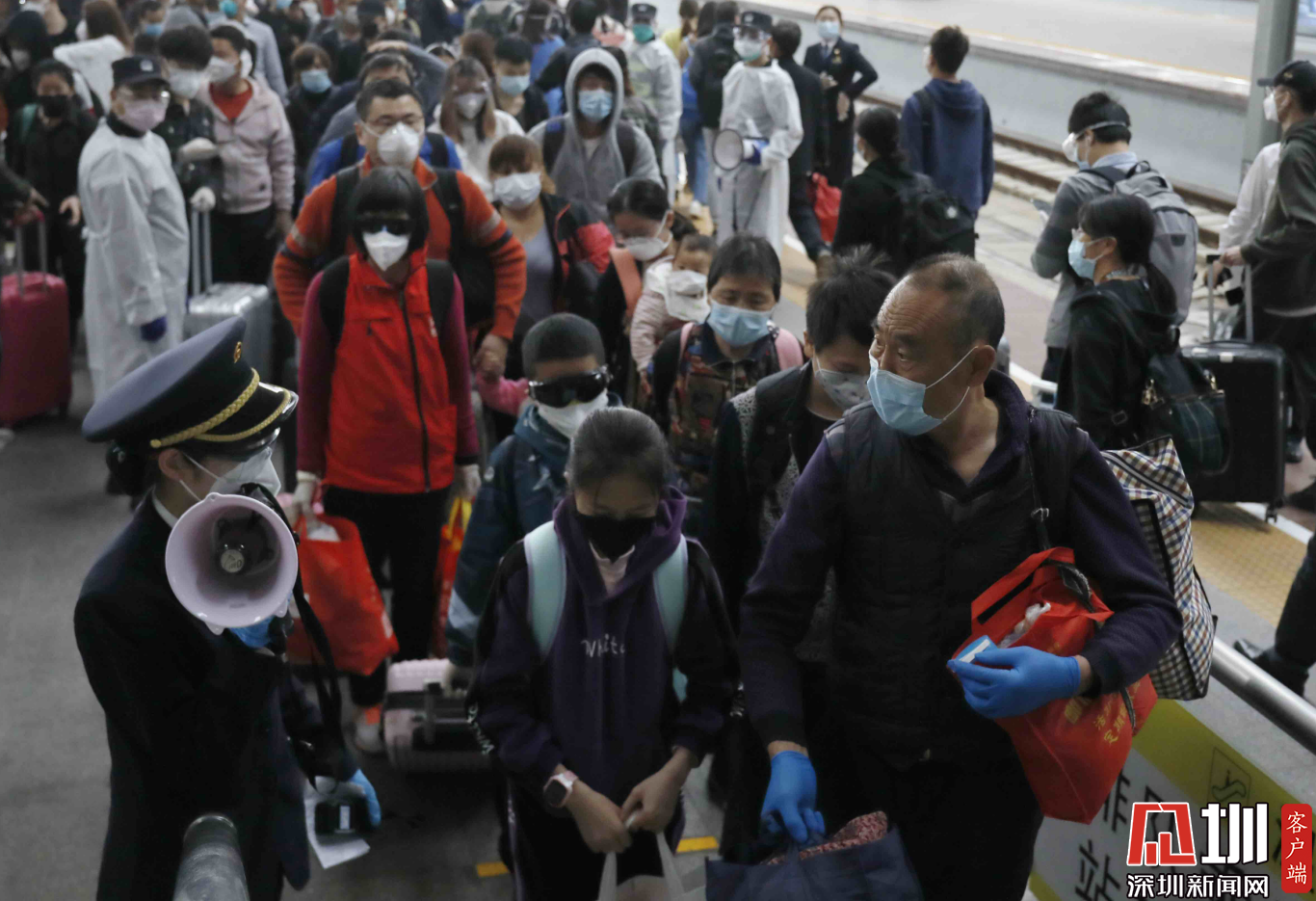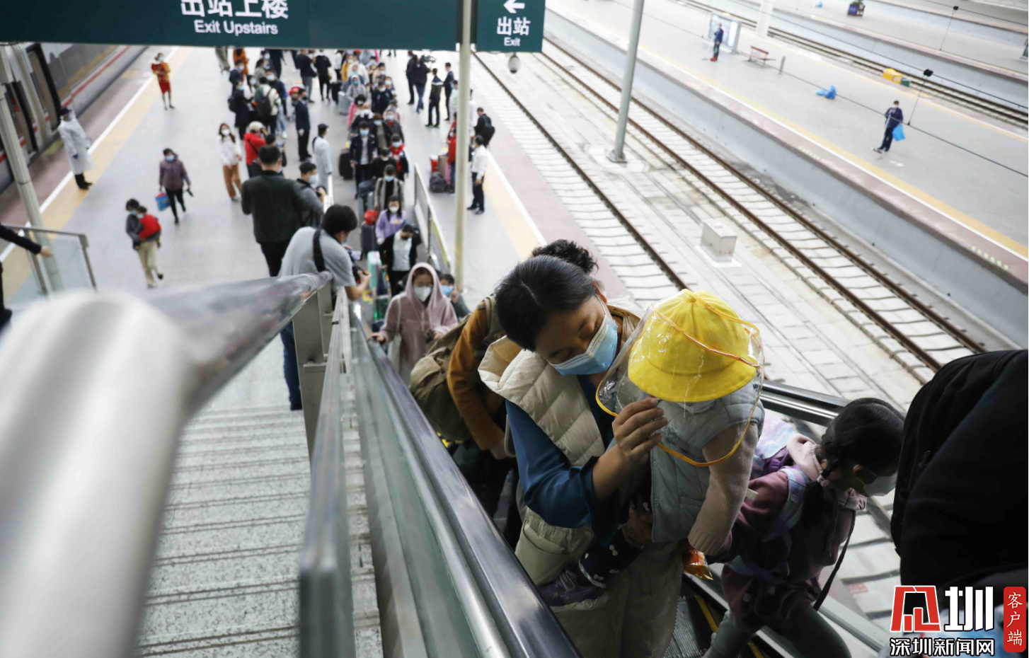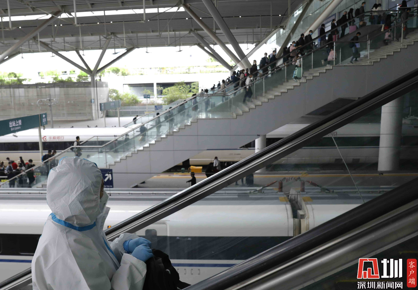 深圳北站西廣場出站口,三位“全副武裝”的旅客。