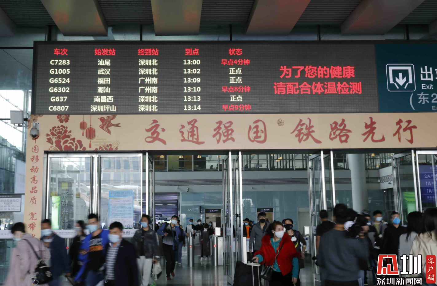 深圳北站東廣場出站口處,G1005車次在顯示屏上出現(xiàn)。