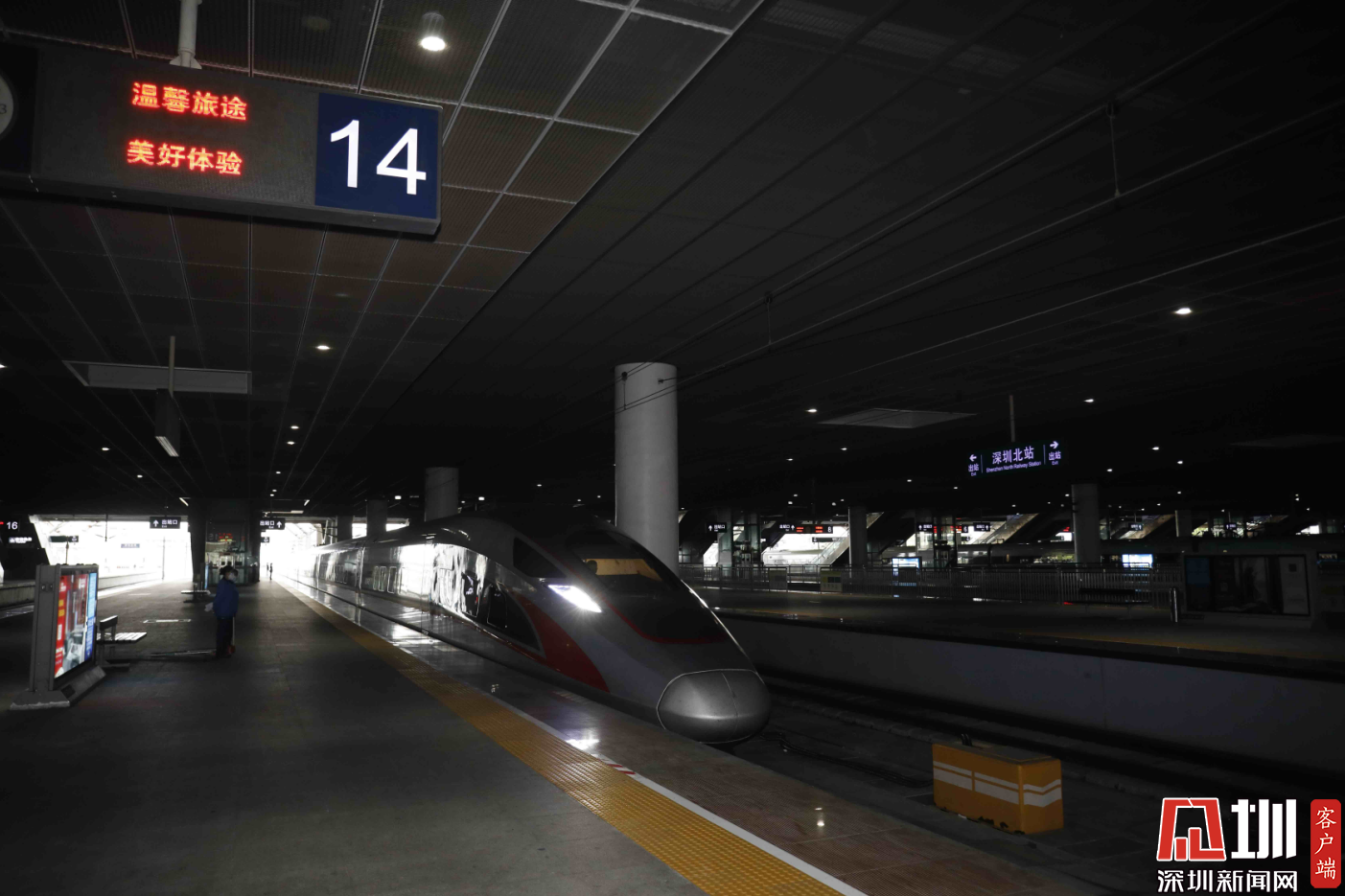 4月8日中午13點(diǎn)02分,G1005次高鐵到達(dá)深圳北站14站臺。