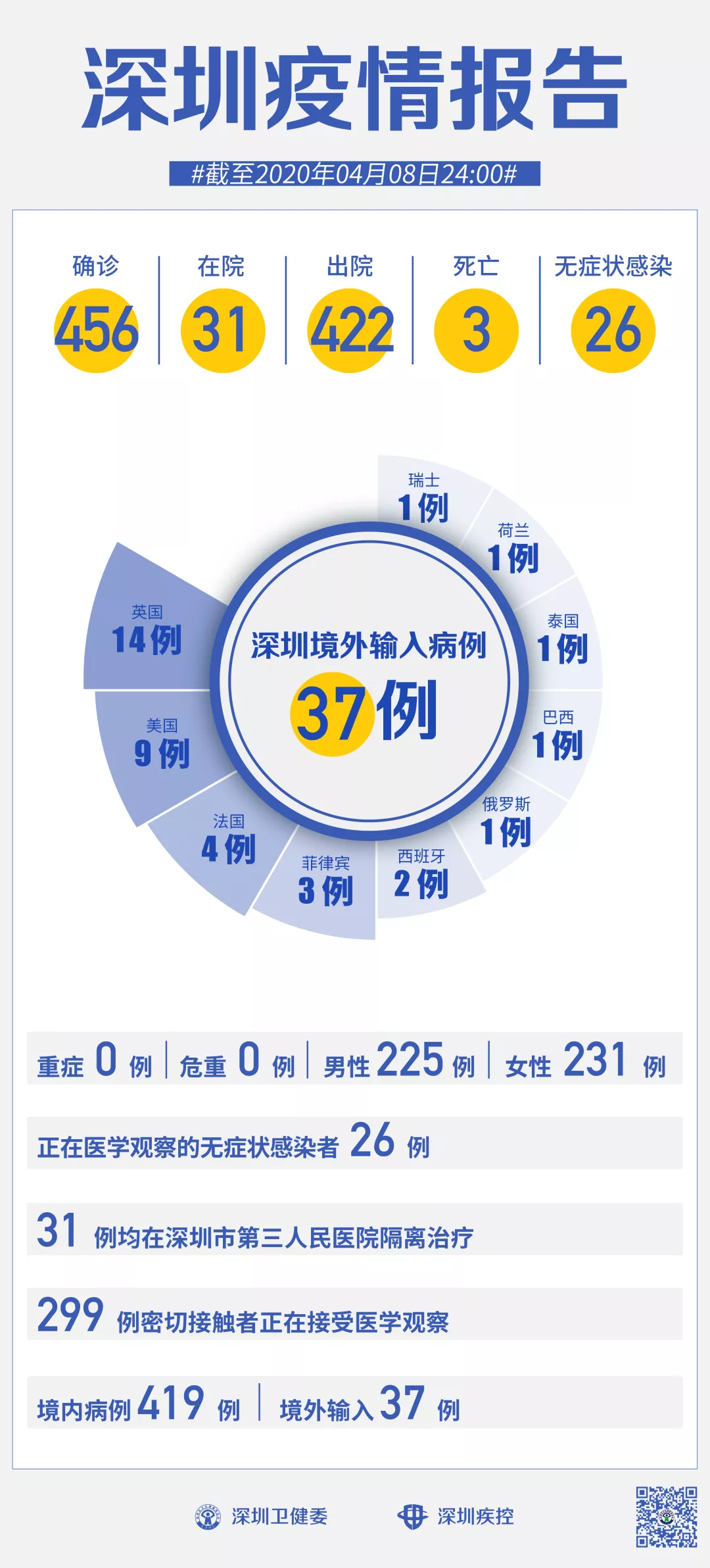 截至4月8日24時,深圳累計報告新冠肺炎病例456例。4月8日當天新增無癥狀感染者1例,出院1例。