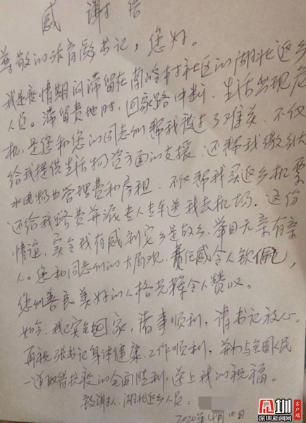 “謝謝你們!”南嶺村這位湖北老鄉(xiāng)返鄉(xiāng)后送來了感謝信