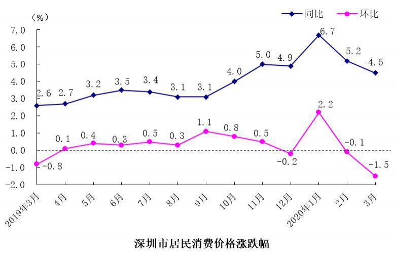 深圳特區(qū)報(bào)2020年4月12日訊 4月12日,國(guó)家統(tǒng)計(jì)局深圳調(diào)查隊(duì)發(fā)布最新統(tǒng)計(jì)數(shù)據(jù),3月份,深圳居民消費(fèi)價(jià)格(CPI)環(huán)比下降1.5 %,降幅比上月擴(kuò)大1.4個(gè)百分點(diǎn);CPI同比上漲4.5%,漲幅比上月收窄0.7個(gè)百分點(diǎn)。