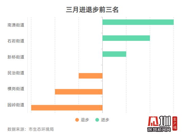 空氣質(zhì)量排名前十的街道是:桃源街道、黃貝街道、南灣街道、南湖街道、東湖街道、蓮塘街道、蛇口街道、福保街道、海山街道和東曉街道;空氣質(zhì)量排名倒數(shù)十位的街道是:馬田街道、新安街道、觀瀾街道、筍崗街道、園嶺街道、福城街道、沙井街道、沙河街道、華強北街道和大浪街道。