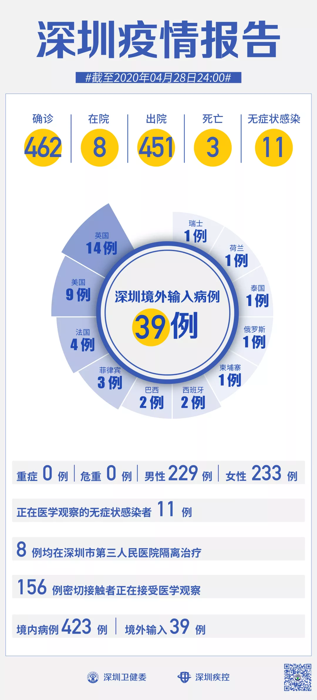 截至4月28日24時(shí),深圳累計(jì)報(bào)告新冠肺炎病例462例。4月28日當(dāng)天新增境內(nèi)病例1例,出院4例。