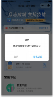 ①在首頁開學專區(qū)點擊“學生登記”,若家長之前未進行自主申報和實名認證,系統(tǒng)將彈出提示,請家長本人先完成自主申報和實名認證。