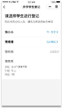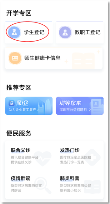 ①在首頁開學專區(qū),點擊“學生登記”進入申報人員列表,進行自主申報和實名認證,再進行開學登記。