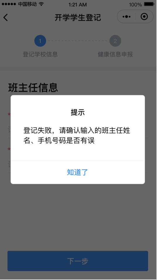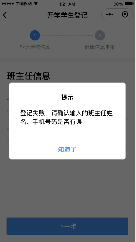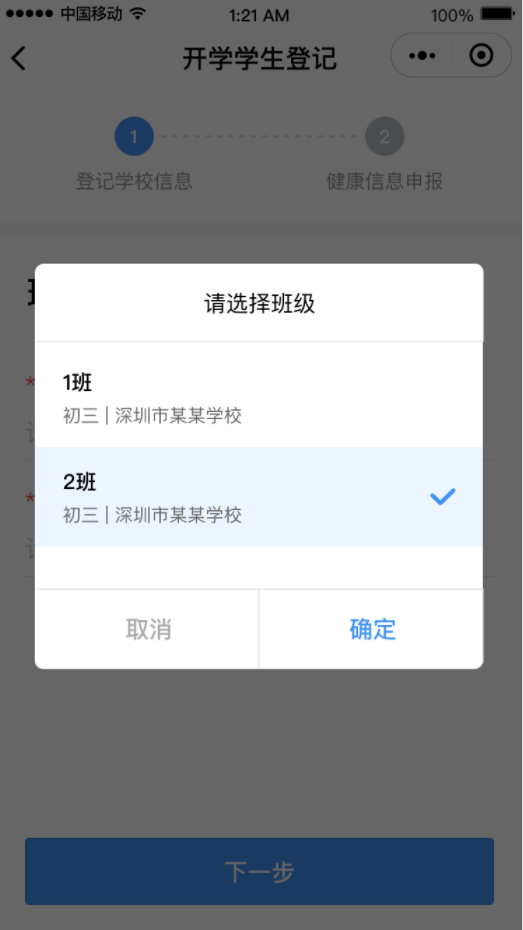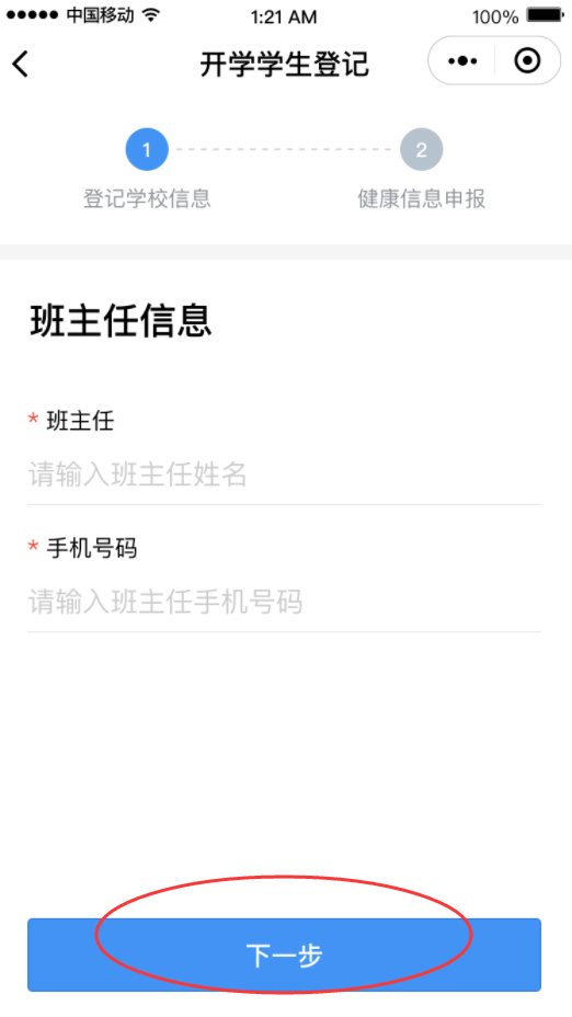 ②進入“學生登記”頁面,點擊“馬上登記”按鈕,填寫班主任姓名和手機號碼后點擊“下一步”,然后選擇對應(yīng)的班級,進入健康申報卡界面。