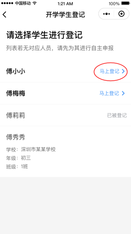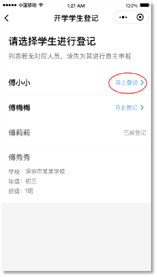 ③完成后進入“開學學生登記”頁面,選擇學生名字旁邊的“馬上登記”,填寫班主任姓名和手機號碼后點擊“下一步”。