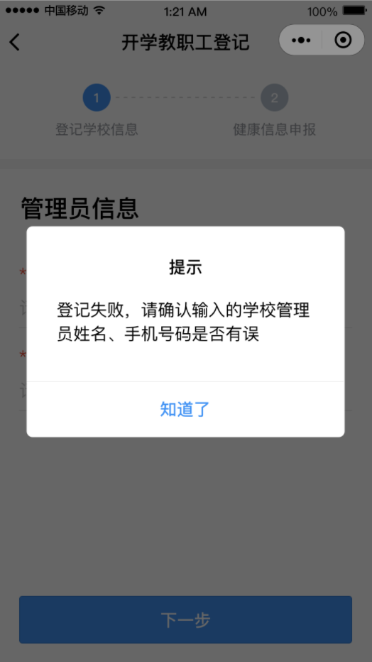 ②點擊“馬上登記”按鈕,填寫學校管理員姓名和手機號碼(學校管理員姓名和手機號碼請詢問學校獲得)后點擊“下一步”,然后選擇對應的學校。