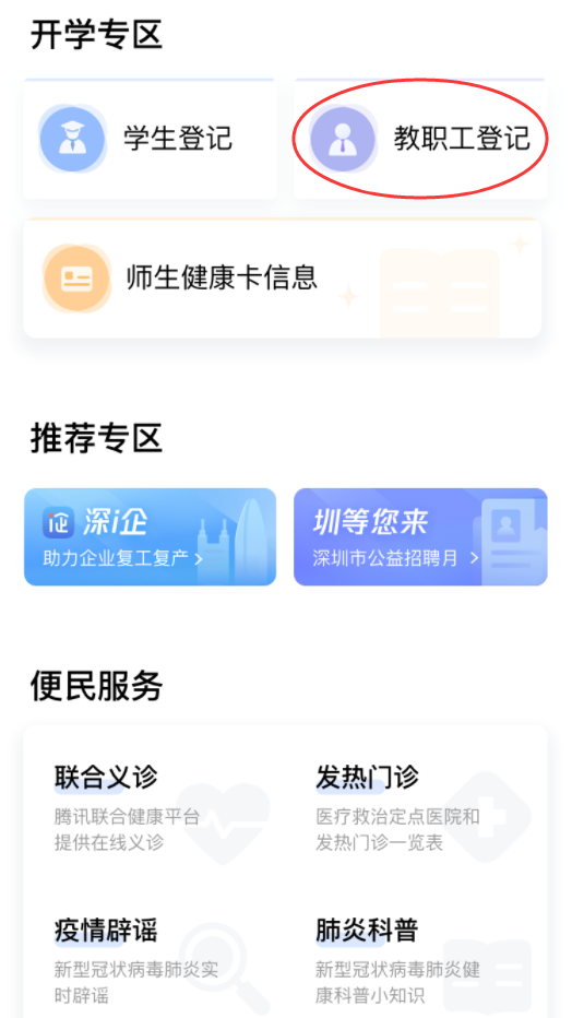 ①在首頁開學專區(qū),點擊“教職工登記”進入申報人員列表,進行自主申報和實名認證。
