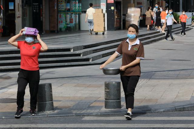 ▲走在街上,熱浪撲面而來(lái),耀眼的陽(yáng)光把人曬得睜不開眼,行人紛紛拿起手頭物品遮擋烈日。